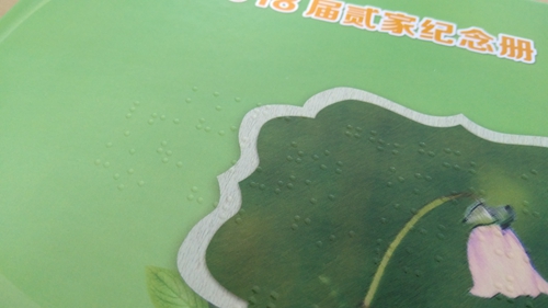 一個(gè)架子上,放著一疊厚實(shí)的精裝冊(cè)子,封面寫著“2018屆貳家紀(jì)念冊(cè)”。翻開冊(cè)子,與以往見到的一樣,紙面印著一張張燦爛而純真的笑臉和一些文字,不一樣的是,紙面上還多了一些微微凸起圓點(diǎn),大約厚度1mm左右,按一種特有的規(guī)律排列,看起來晶瑩剔透,用手撫摸一下,顆粒感很真實(shí),這就是“盲文畢業(yè)紀(jì)念冊(cè)”。